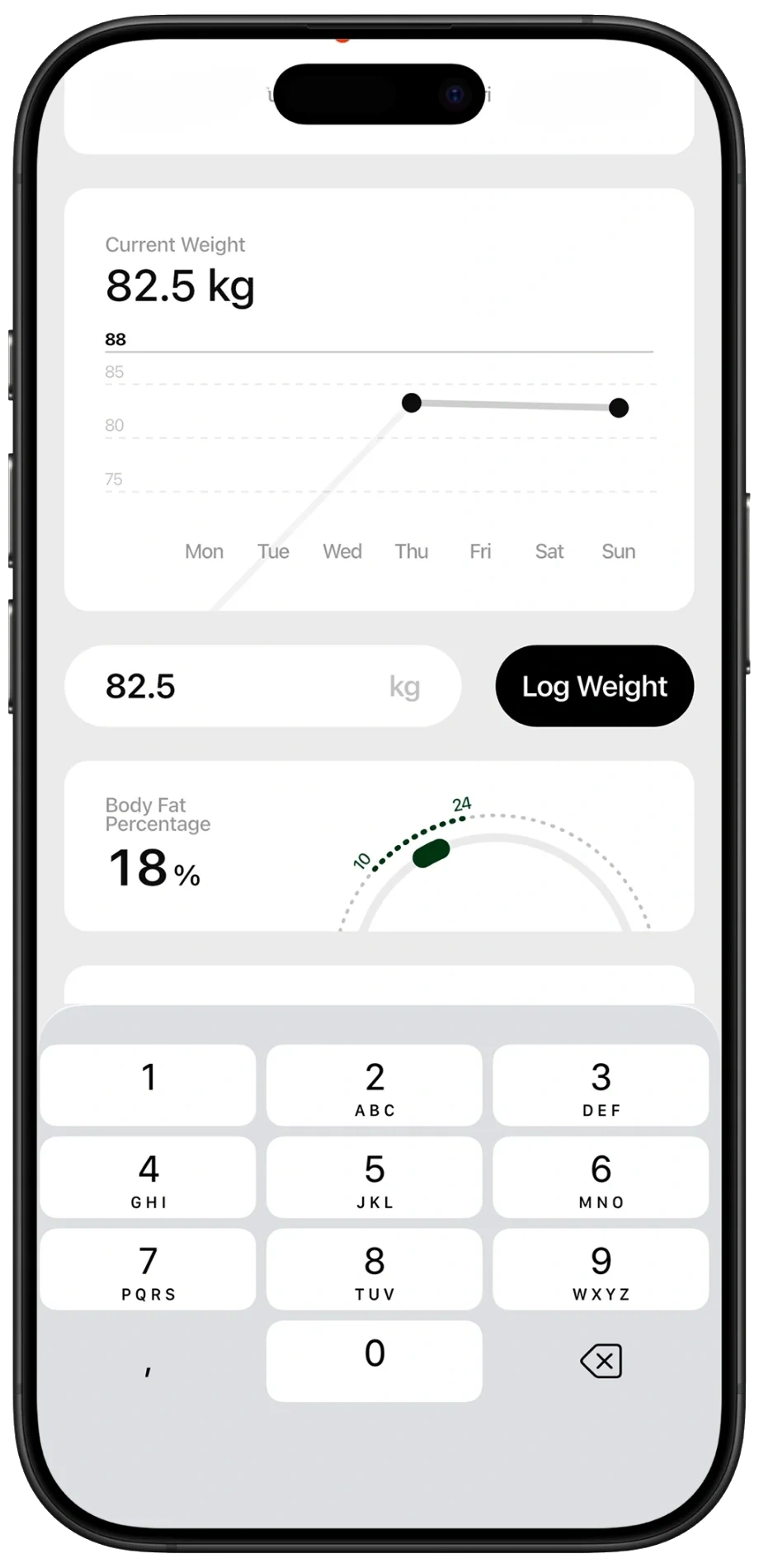 Log your weight, set a goal, and visualize trends over weeks and months. See your BMI category, track progress toward your target weight, and correlate weight changes with your nutrition data.
